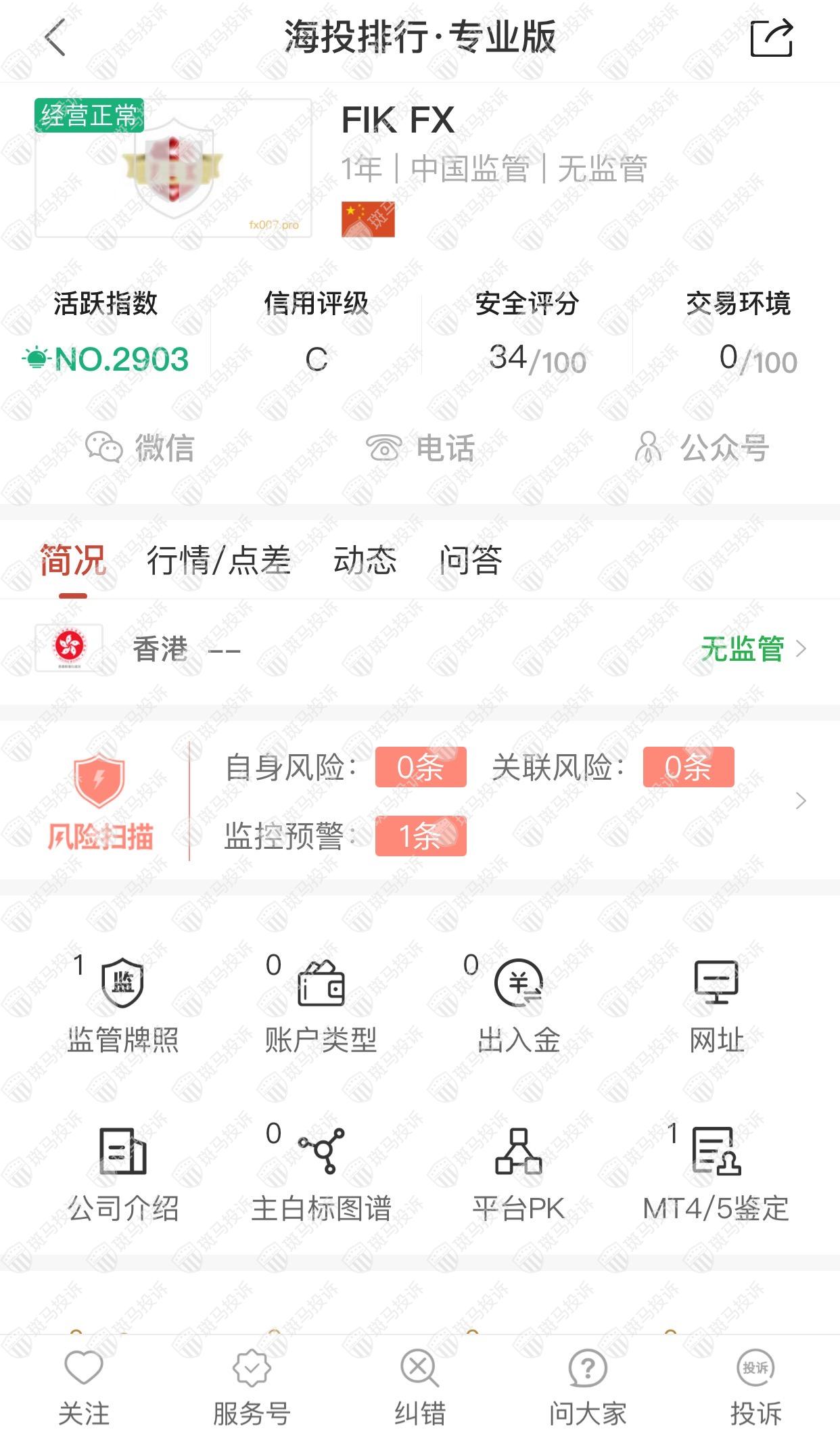 这家平台叫FIK FX,成立于2020年,全球排名2903名,目前无监管,没有外汇牌照,不能做外汇保证金交易,风险扫描显示1条风险,投资者资金安全无保障。