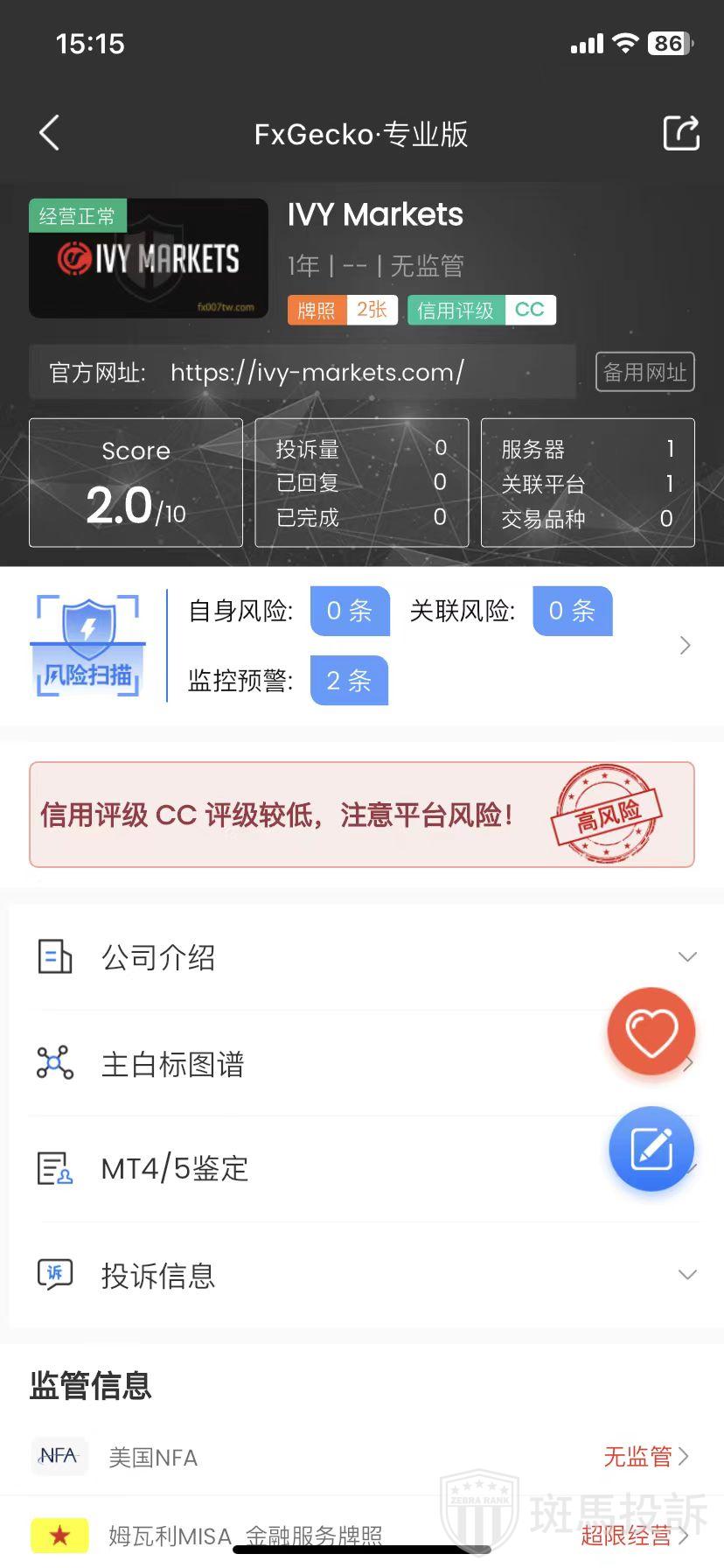 FxGecko风险提示:IVY Markets外汇平台监控预警2条。注意提前预警!