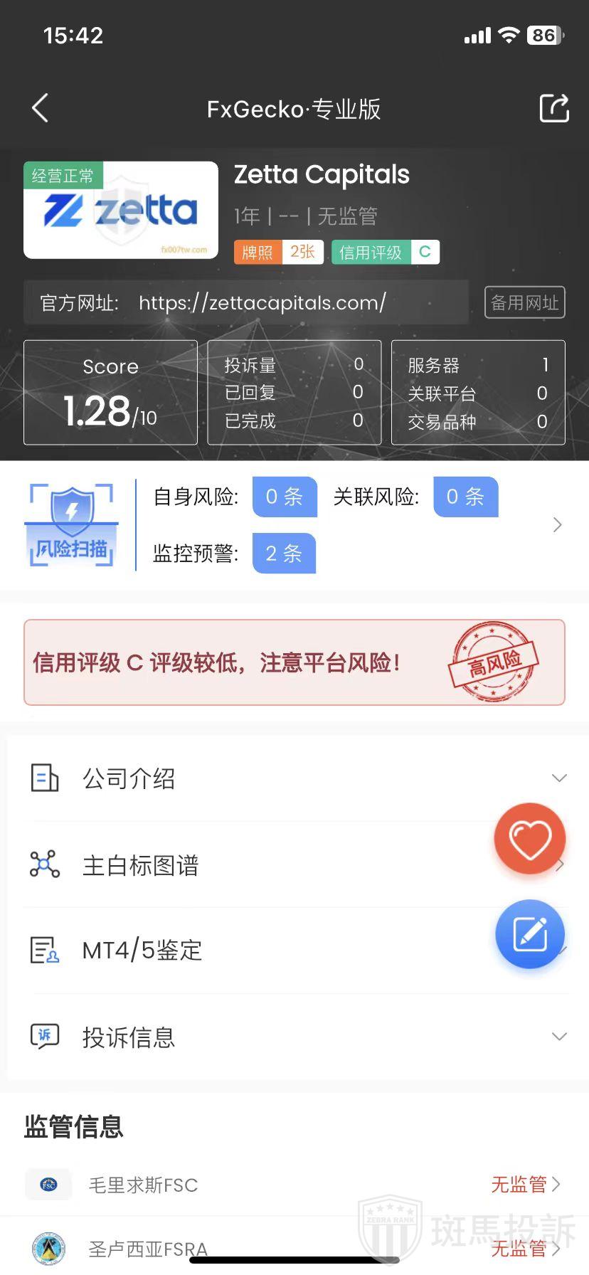 FxGecko风险提示:Zetta Capital外汇平台监控预警2条。注意提前预警!