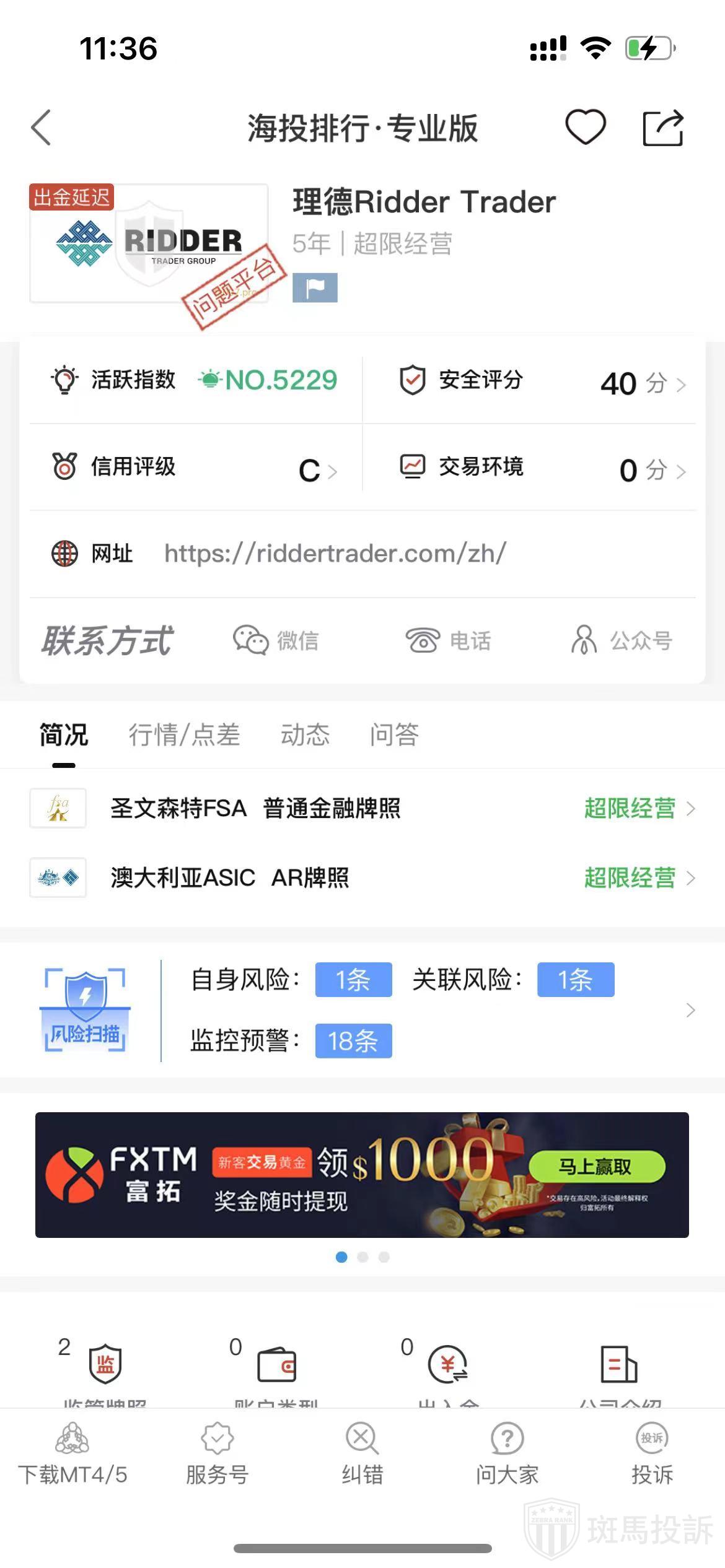 根据海投排行查询显示,这家平台叫理德Ridder Trader,成立于2020年,全球排名5086名,安全评分40分,前有圣文森特和格林纳丁斯FSA普通注册、澳大利亚ASIC AR牌照2个监管,风险扫描预警有20条.