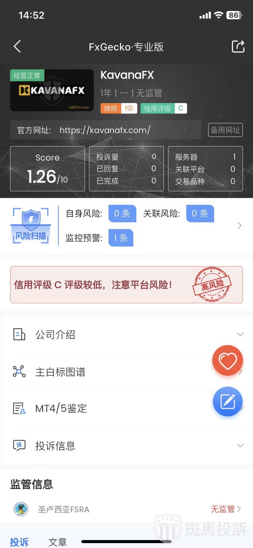 KavanaFX,FxGecko评分1.26分,信用评级较低,建议投资者远离!