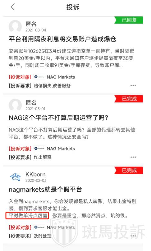 更令人关注的是,NAG Markets的客户投诉问题。目前,已有3条客户投诉记录在案,主要涉及滑点严重和利用隔夜利息导致账户爆仓的问题。这些问题不仅损害了投资者的利益,也暴露了平台在风险控制和客户服务方面的不足。