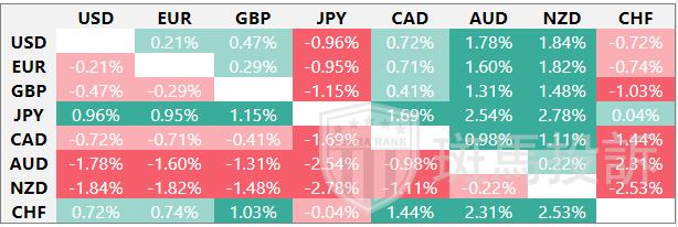 下表显示了美元(USD)对所列主要货币最近七天的变动百分比。[货币名称]对[货币名称]最强。