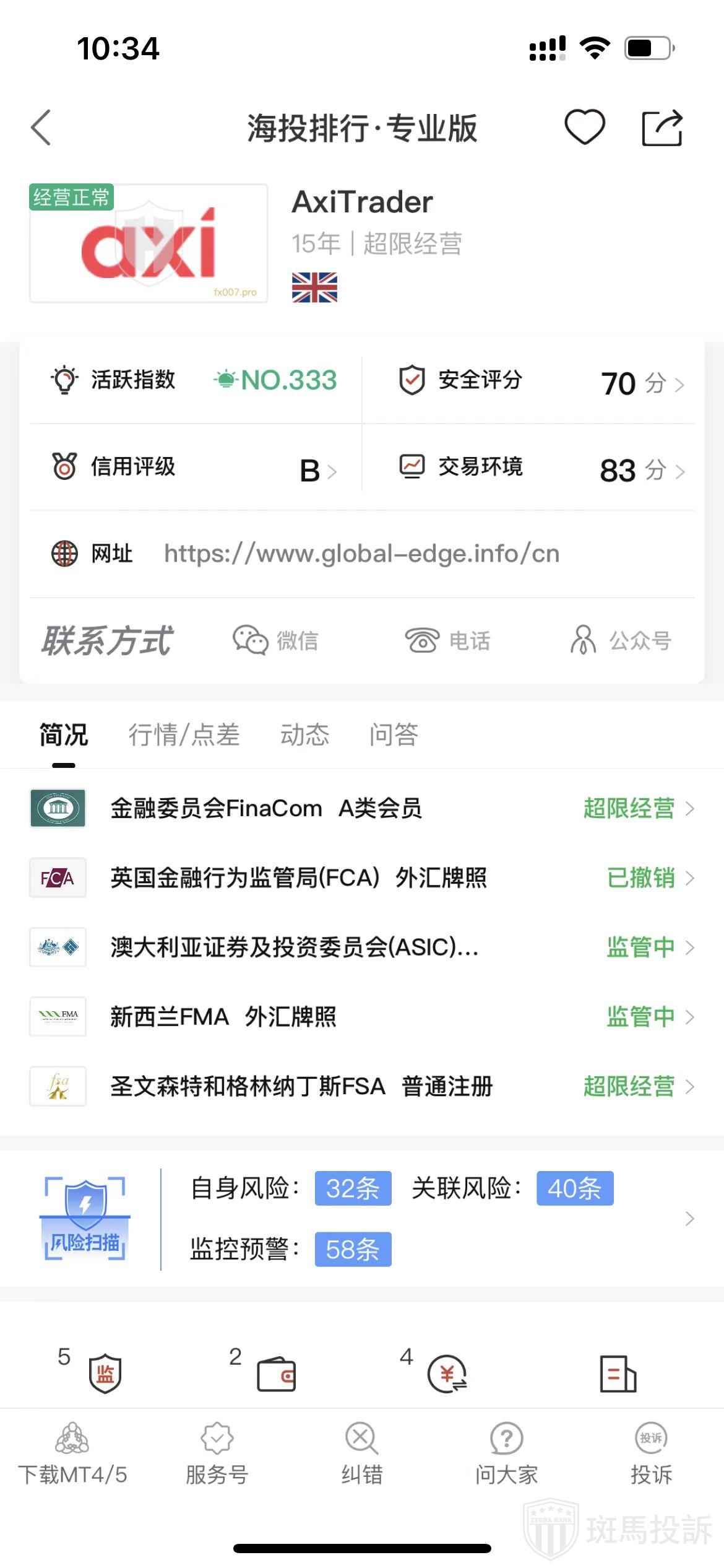 根据海投排行查询显示,这家平台叫AxiTrader,成立于2010年,全球排名334名,安全评分70分,目前英国FCA市商牌照、金融委员会FINACOM,新西兰FMA外汇牌照、澳大利亚ASIC市商牌照,圣文森特和格林纳丁斯FSA牌照的监管,风险扫描128条。