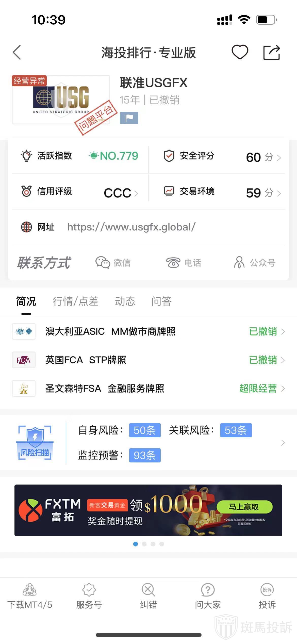 根据海投排行查询显示,这家平台叫联准USGFX,成立于2010年,全球排名778名,安全评分70分,平台宣传称拥有英国FCA STP牌照、圣文森特FSA金融服务牌照和澳大利亚ASIC市商牌照的监管,风险扫描196条。
