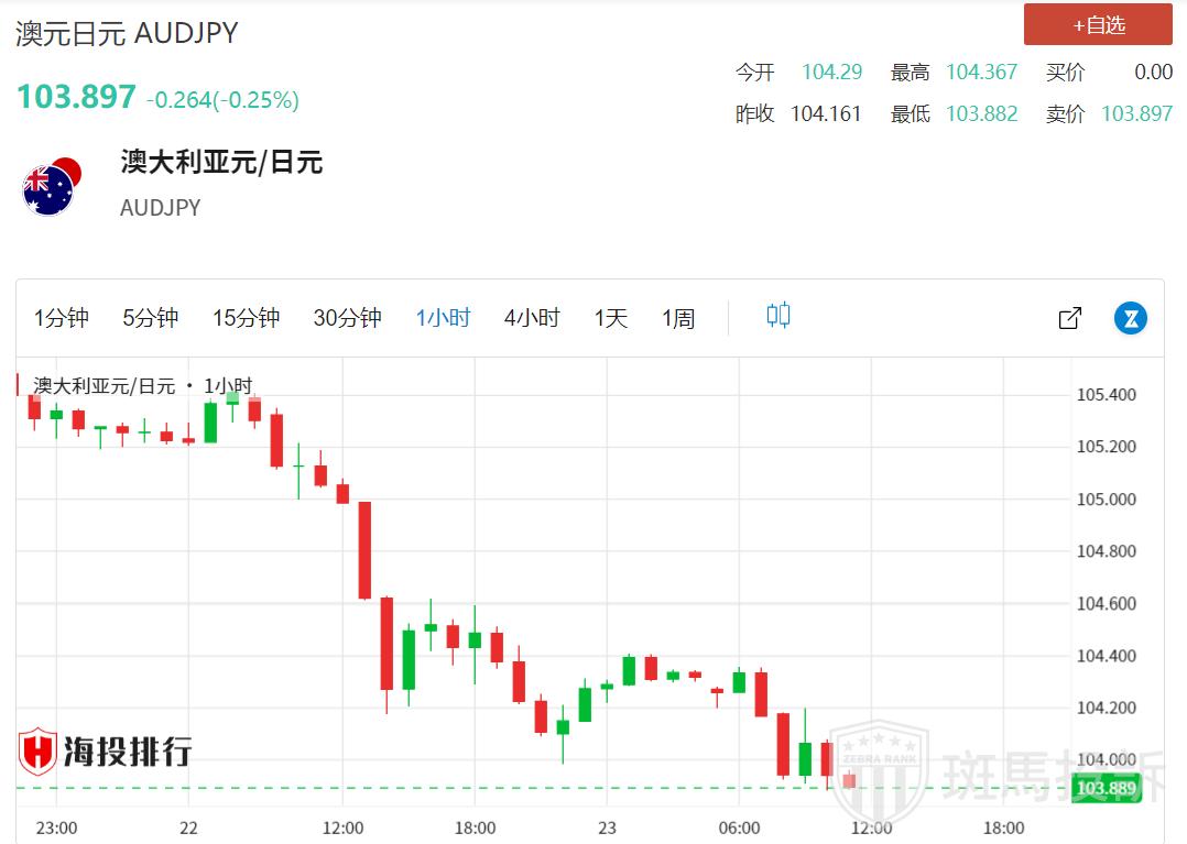 周二,澳元/日元连续第三天震荡走低,这也是前十个交易日中第九个交易日澳元/日元震荡走低,并在亚市下跌至6月17日以来的最低水平。澳元/日元最新进一步跌破103.89关口,空头预期澳元/日元将延续自本月初触及的1991年5月以来最高水平以来的近期整理跌势。