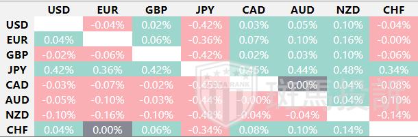 热图显示了主要货币对的波动百分比变化。基准货币从左列中选取,报价货币从顶行中选取。例如,如果投资者从左列选择欧元,然后沿水平线移动到日元,方框中显示的百分比变化即为欧元/日元波动。