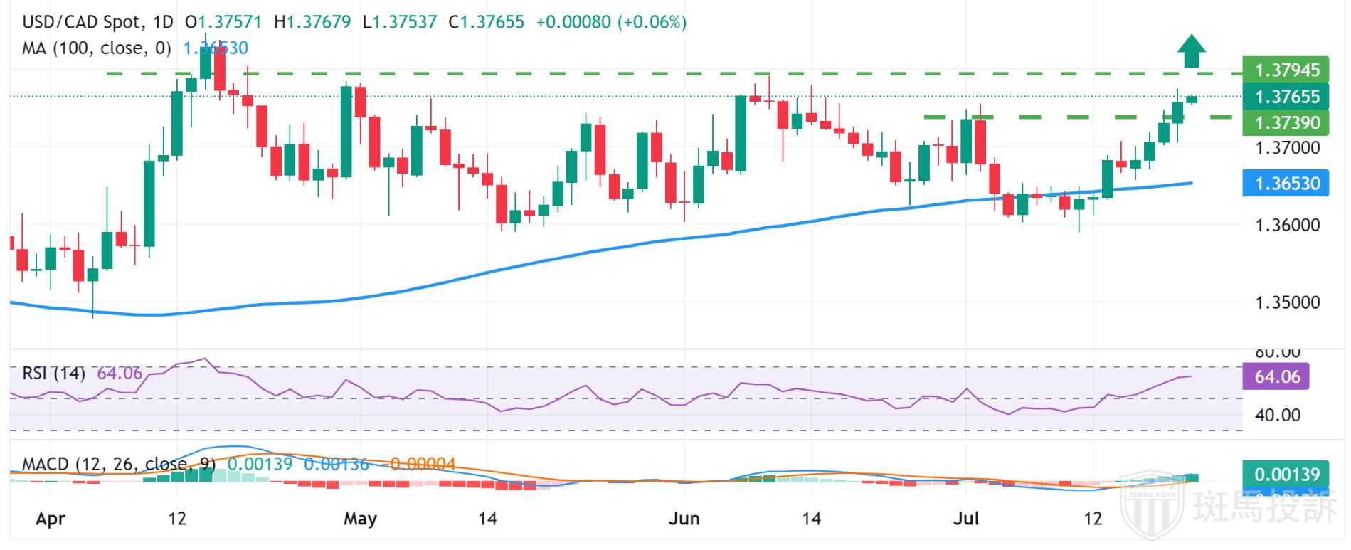 从技术角度来看,隔夜美元/加元持续突破并稳定在1.3740的供应区上方,这是一个重要的看涨信号。此外,日线图上的震荡指标仍处于积极区域,尚未进入超买区,进一步验证了看涨倾向。这表明美元/加元未来上涨的可能性更大。