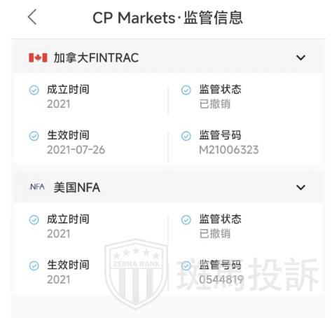 CP Markets曾受到加拿大FINTRAC和美国NFA的监管,但值得注意的是,这两个监管机构仅授予其金融服务牌照,并不涵盖外汇交易。更为严重的是,目前这两个监管牌照已被撤销,CP Markets失去了任何有效的金融监管。没有监管的外汇经纪商,如同脱缰的野马,风险难以控制。