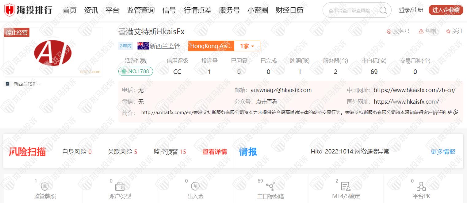 这家平台叫HkaisFx香港艾特斯,成立于2020年,全球排名1788名,目前停止经营,无监管,没有外汇牌照,不能做外汇保证金交易,风险扫描显示15条风险,投资者资金安全无保障。