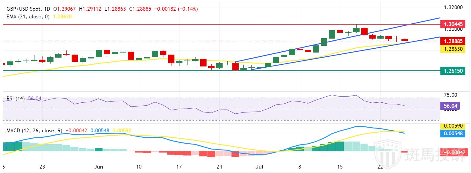 上行方面,短期阻力位于心理价位1.2900。若突破该水平,英镑/美元可能会接近上升通道上边界1.3040的关键水平附近,然后是7月17日触及的年内峰值1.3044水平。