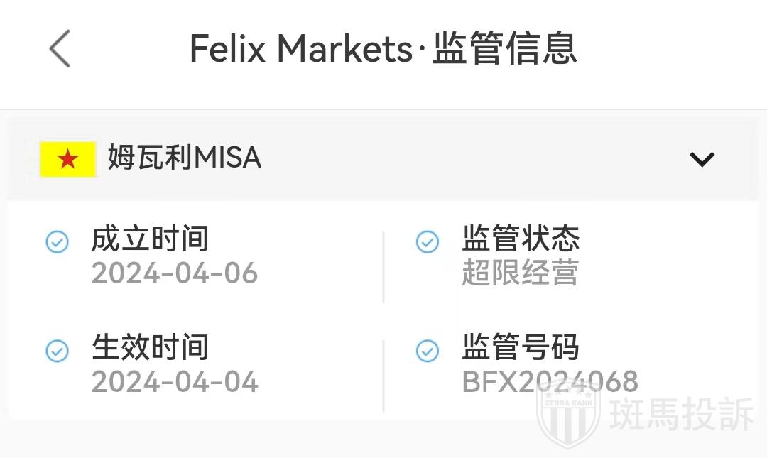 Felix Markets平台受姆瓦利MISA监管,取得金融服务牌照,监管号码BFX2024068,属于超限经营范畴。