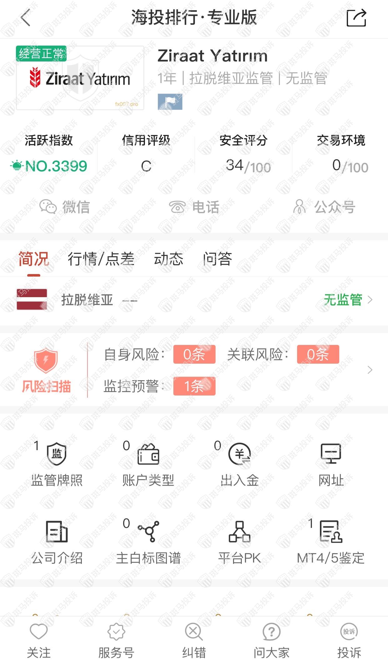 这家平台叫Ziraat Yatırım,成立于2021年,全球排名3399名,目前无监管,没有外汇牌照,不能做外汇保证金交易,风险扫描显示1条风险,投资者资金安全无保障。
