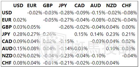 下表显示了今天日元(JPY)对所列主要货币的变动百分比。日元对美元是最强的。