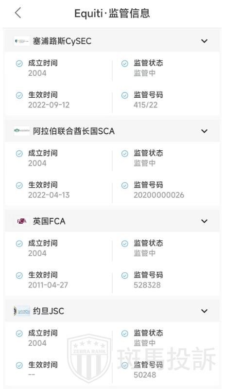 Equiti目前拥有4重监管,包括英国FCA的MM做市商牌照、约旦JSC的外汇牌照、阿拉伯联合酋长国SCA的金融服务牌照以及塞浦路斯CySEC的MM做市商牌照。虽然拥有多重监管,但投资者应关注监管机构的权威性和监管力度,以及经纪商是否严格遵守监管要求。