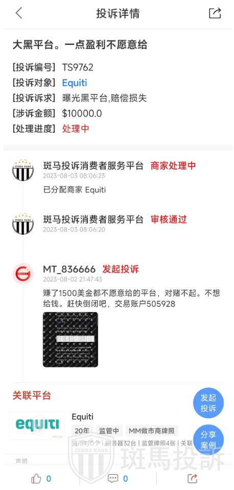 Equiti目前有1条客户投诉,投诉内容涉及平台对赌不起,盈利不给出金。这一投诉虽然单一,但反映了客户对Equiti服务的不满和担忧。投资者在选择经纪商时,应密切关注客户反馈和投诉处理情况,这是衡量经纪商服务质量的重要指标。