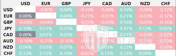 热图显示了主要货币对的波动百分比变化。基准货币从左列中选取,报价货币从顶行中选取。例如,如果投资者从左列选择美元,然后沿水平线移动到日元,方框中显示的百分比变化即为美元/日元波动。