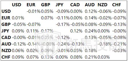 下表显示了今天澳元对列出的主要货币的百分比变化。澳元对日元是最弱的。