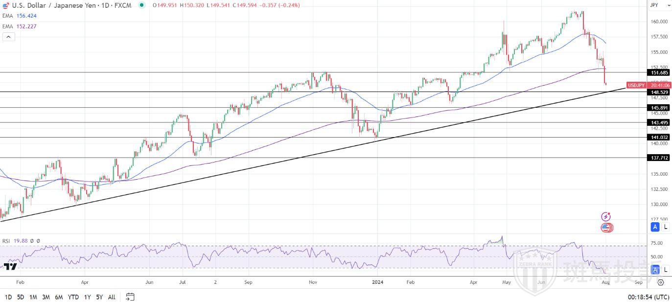 - 50天和200天EMA:美元/日元跌破了这两个关键均线,发出看跌信号。