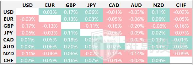热图显示了主要货币对的波动百分比变化。基准货币从左列中选取,报价货币从顶行中选取。例如,如果投资者从左列选择欧元,然后沿水平线移动到日元,方框中显示的百分比变化即为欧元/日元波动。