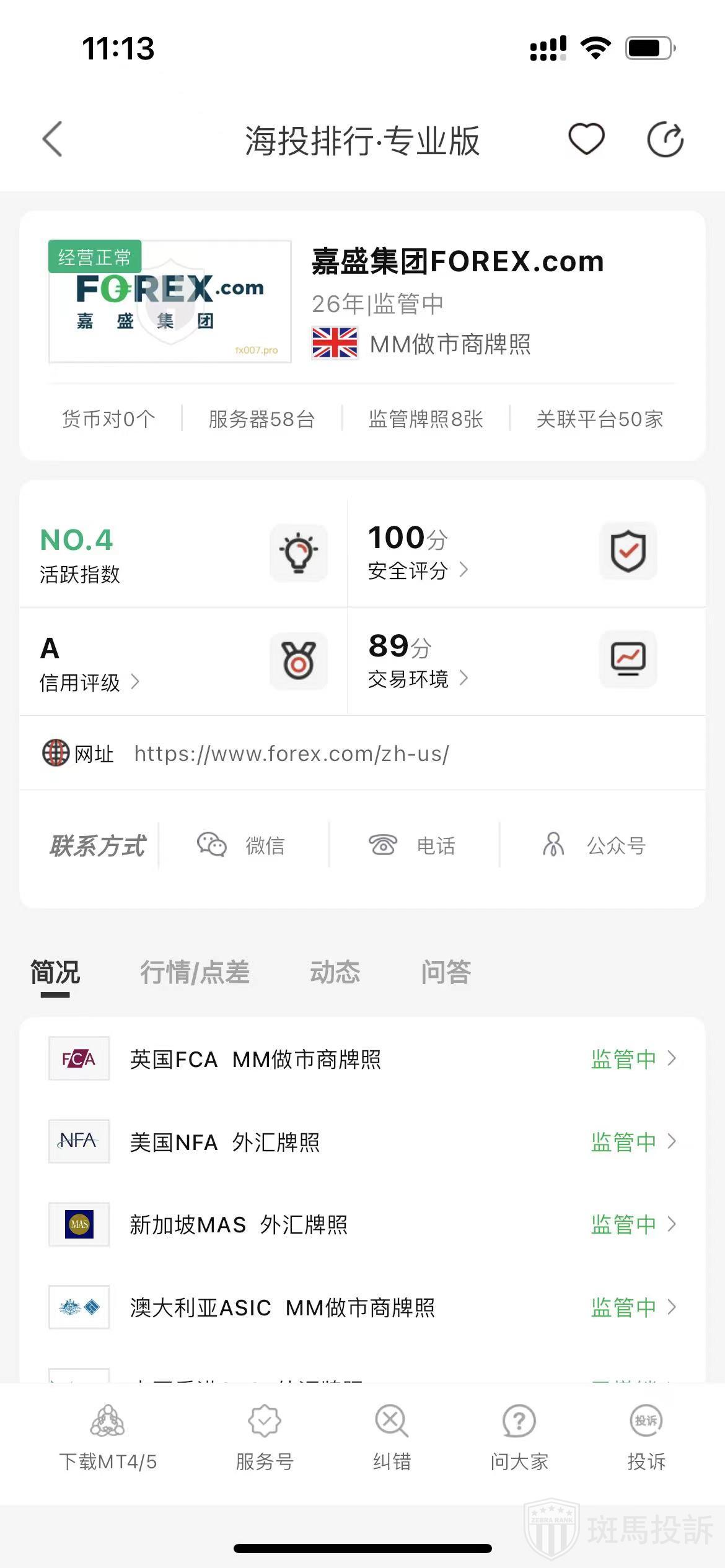 根据海投排行查询显示,这家平台叫嘉盛集团FOREX.com,成立于1999年,全球排名32名,安全评分80分,平台宣传称拥有英国FCA STP牌照,美国NFA、新加坡MAS、澳大利亚ASIC、中国香港SFC、日本FSA、加拿大IIROC、开曼群岛CIMA等多个国家的监管牌照,风险扫描预警有326条.