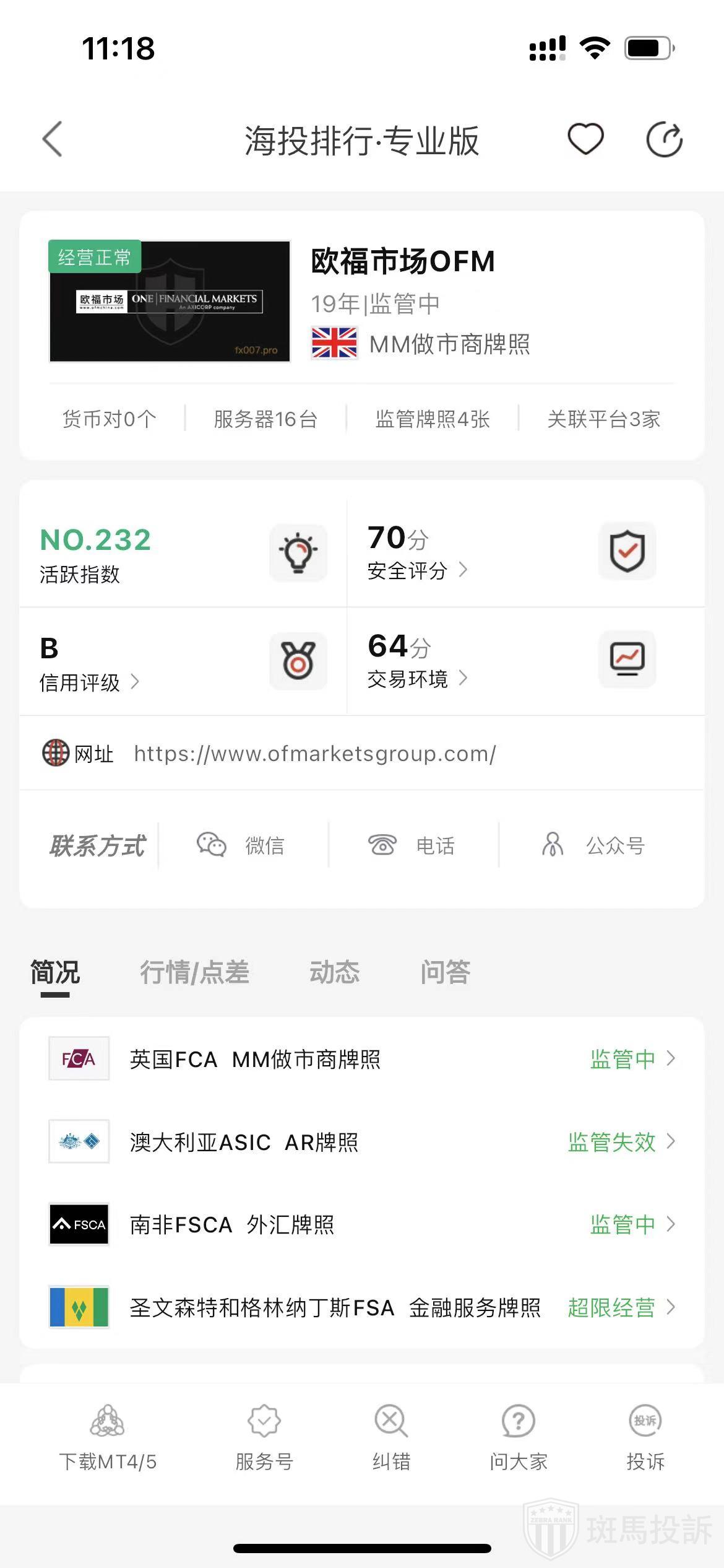 根据海投排行查询显示,这家平台叫欧福市场OFM,成立于2006年,全球排名235名,安全评分70分,平台宣传称拥有英国FCA市商牌照,澳大利亚ASIC AR牌照、南非FSCA外汇牌照和圣文森特和格林纳丁斯FSA等多个国家的监管牌照,风险扫描预警有68条.