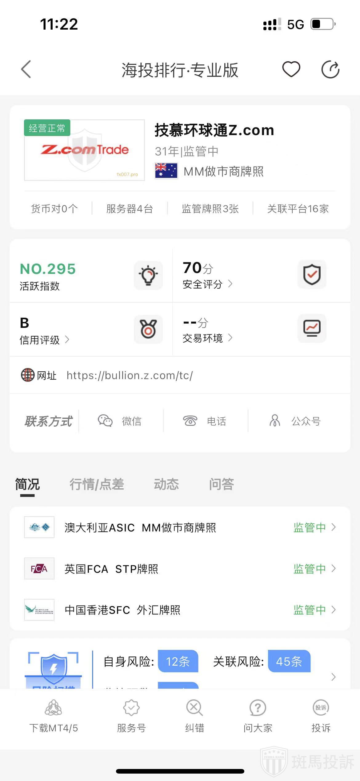 根据海投排行查询显示,这家平台叫技慕环球通Z.com,成立于1994年,全球排名297名,安全评分70分,平台宣传称拥有英国FCA STP牌照,、澳大利亚ASIC、中国香港SFC等多个国家的监管牌照,风险扫描预警有72条.
