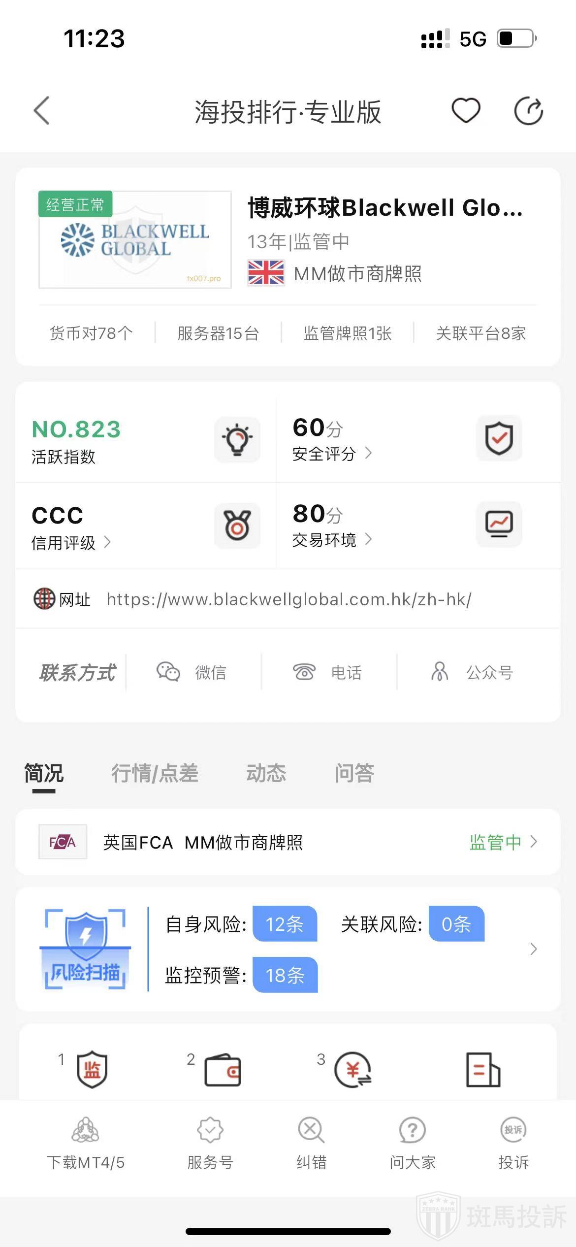 根据海投排行查询显示,这家平台叫博威环球Blackwell Global,成立于2012年,全球排名822名,安全评分60分,平台宣传称拥有英国FCA市商牌照,风险扫描预警有30条.