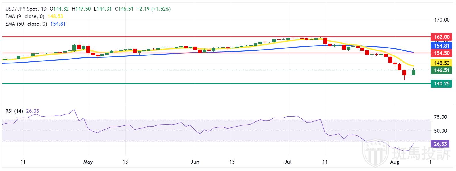 美元/日元周三交投于146.70附近。日线图分析显示,该货币对继续升向九日指数移动平均线(EMA)148.57水平,表明看跌势头减弱。此外,14 天相对强弱指数(RSI)低于 30,表明货币对超卖,可能出现短期反弹。