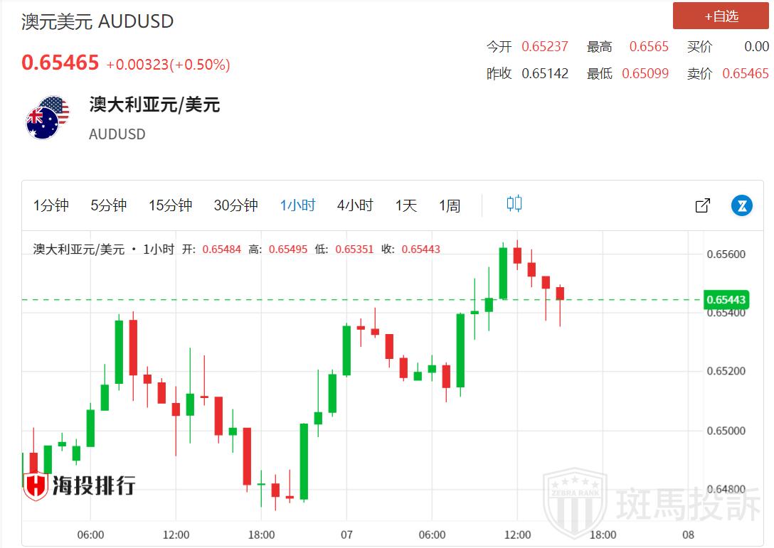 周三欧洲时段早盘,澳元/美元在0.6545附近的正区域交易,当日上涨0.38%。