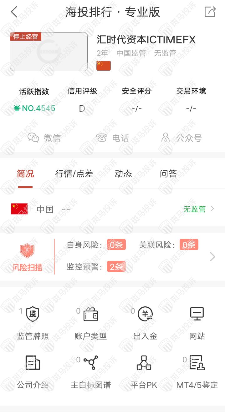 这家平台叫ICTIMEFX汇时代资本,成立于2021年,全球排名4545名,目前无监管,没有外汇牌照,不能做外汇保证金交易,风险扫描显示2条风险,投资者资金安全无保障。