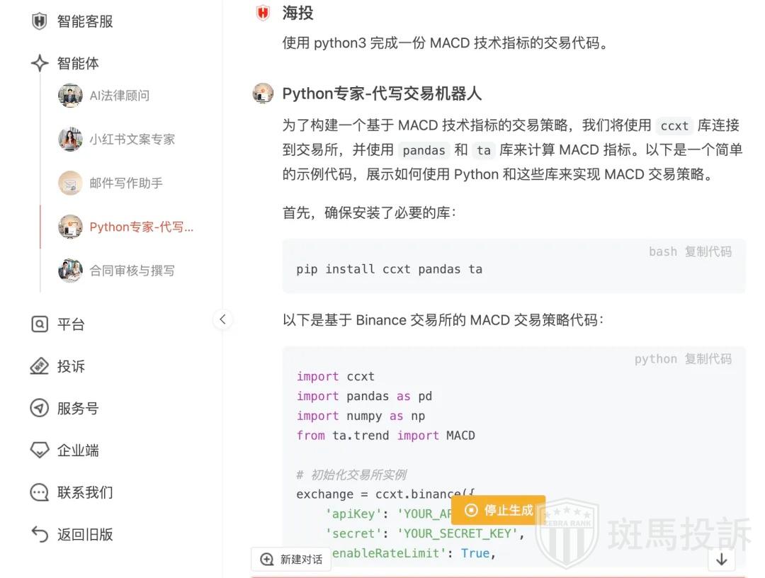 最近,我向 「海投AI- python专家」 提问:“使用 python3 完成一份 MACD 技术指标的交易代码。”它会帮助我完成代码的基础部分,并根据我们的具体需求,进一步的优化代码。详情:5分钟用AI写出1000%收益率的交易策略