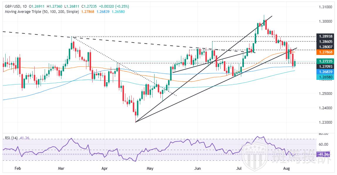另一方面,从技术面来看,英镑兑美元的走势同样不容乐观。日线图上,英镑兑美元已经大幅突破7月份的缩小对称三角形顶部,面临多重技术阻力。目前,50日均线位于1.2784附近,成为英镑反弹的重要障碍。而100日和200日均线在1.26附近的汇合,可能为汇价提供一定的支撑。但要实现真正的反转,英镑兑美元必须在接下来几周内突破50日均线,并重新回到约1.2845的200周移动均线。