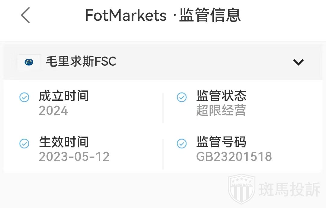 FotMarkets 平台受毛里求斯FSC监管,取得金融服务牌照,监管号码:GB23201518,属于超限经营范畴。
