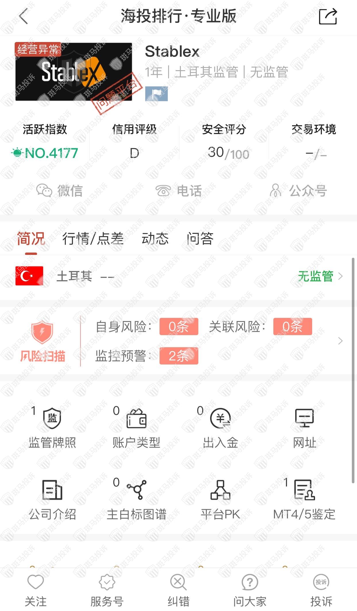 这家平台叫Stablex,成立于2021年,全球排名4176名,目前无监管,没有外汇牌照,不能做外汇保证金交易,风险扫描显示2条风险,投资者资金安全无保障。