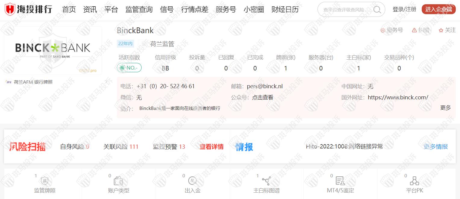 BinckBank成立于2000年,由荷兰AFM监管,风险扫描显示13条风险,投资者需注意其风险提示信息。