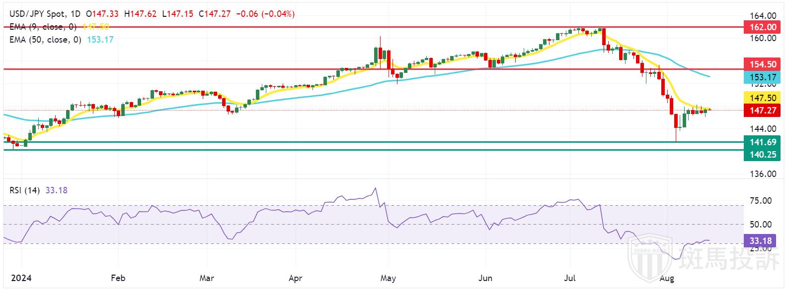 上行阻力位则在九天EMA附近的147.53,以及50天EMA的153.40附近。如果美元/日元突破这些阻力位,可能测试更高的154.50水平。