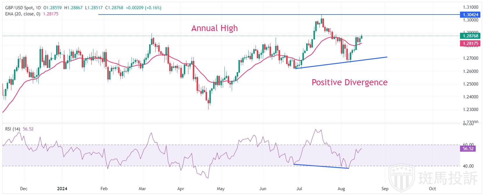 若英镑未能守住当前水平,并跌破8月8日的低点1.2665,则反弹走势可能受阻。这将使英镑面临更大下行压力,测试6月27日的低点1.2613和4月29日的高点1.2570。