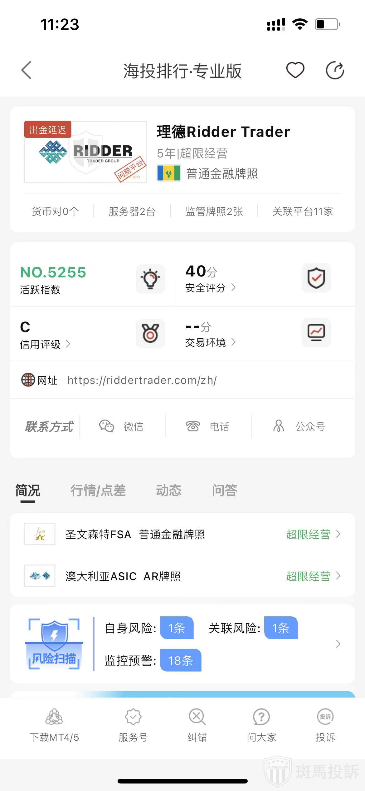 根据海投排行查询显示,这家平台叫理德Ridder Trader,成立于2020年,全球排名5086名,安全评分40分,前有圣文森特和格林纳丁斯FSA普通注册、澳大利亚ASIC AR牌照2个监管,风险扫描预警有20条.