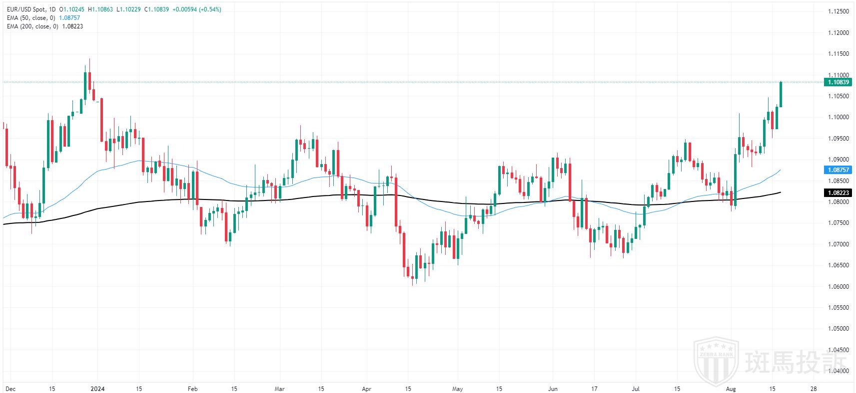 欧元/美元周一触及2024年新高,达到1.1086,展现出强劲的买盘力量。虽然未能突破关键技术阻力位,但货币对自8月初以来已累计上涨近3%,从1.0800附近的200日指数移动均线(EMA)稳步攀升。