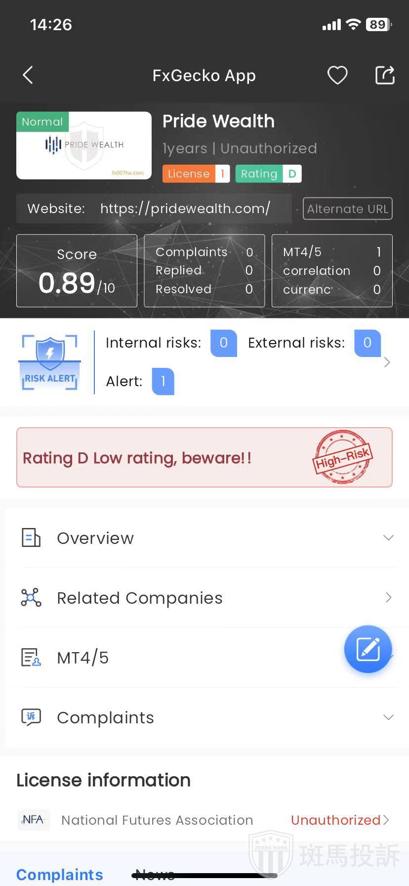 Pride Wealth,FxGecko评分0.89分,信用评级较低,建议投资者远离!