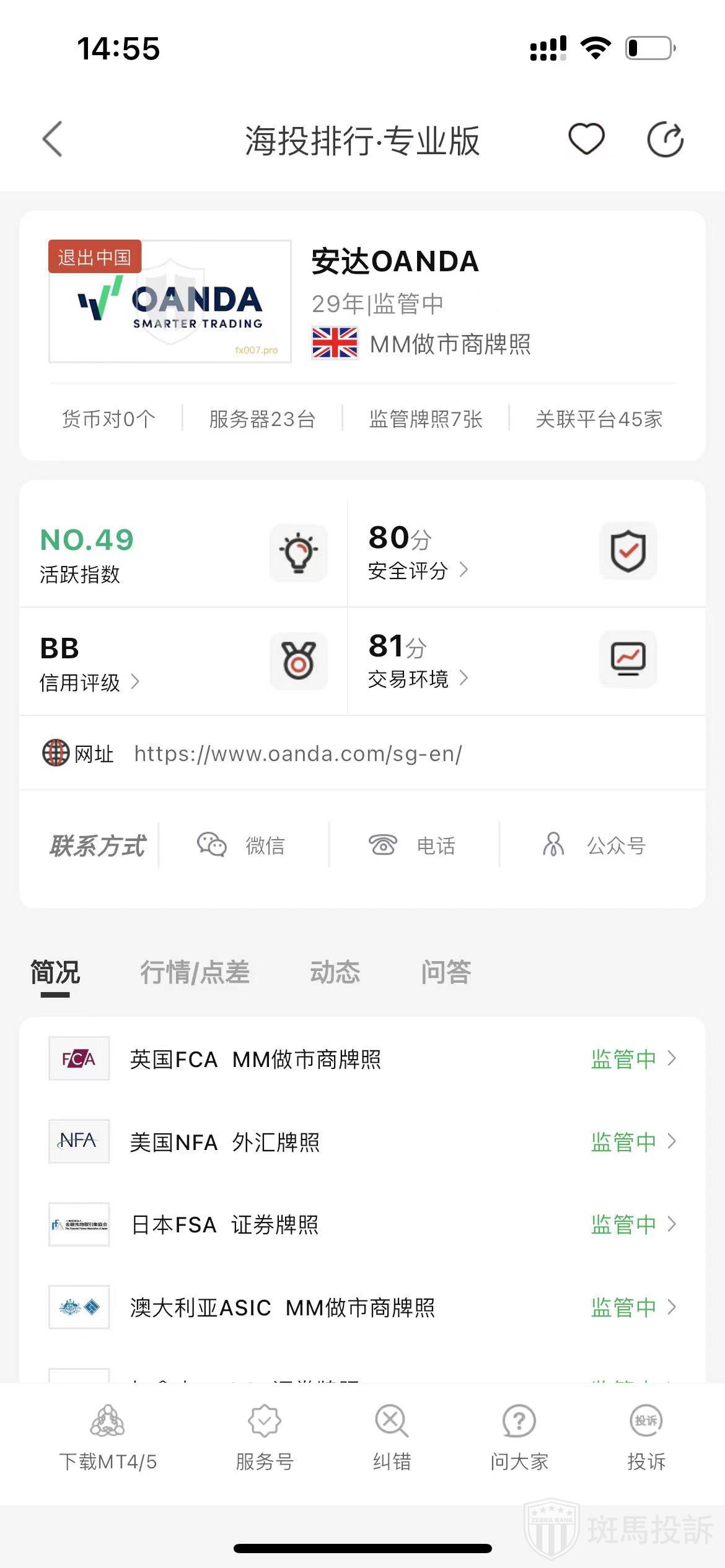 根据海投排行查询显示,这家平台叫安达OANDA,成立于1996年,全球排名48名,安全评分80分,目前有英国FCA市商牌照、美国NFA外汇牌照,日本FSA证券牌照、澳大利亚ASIC市商牌照,加拿大证券牌照、马其他金融服务牌照和新加坡市商牌照,风险扫描868条.