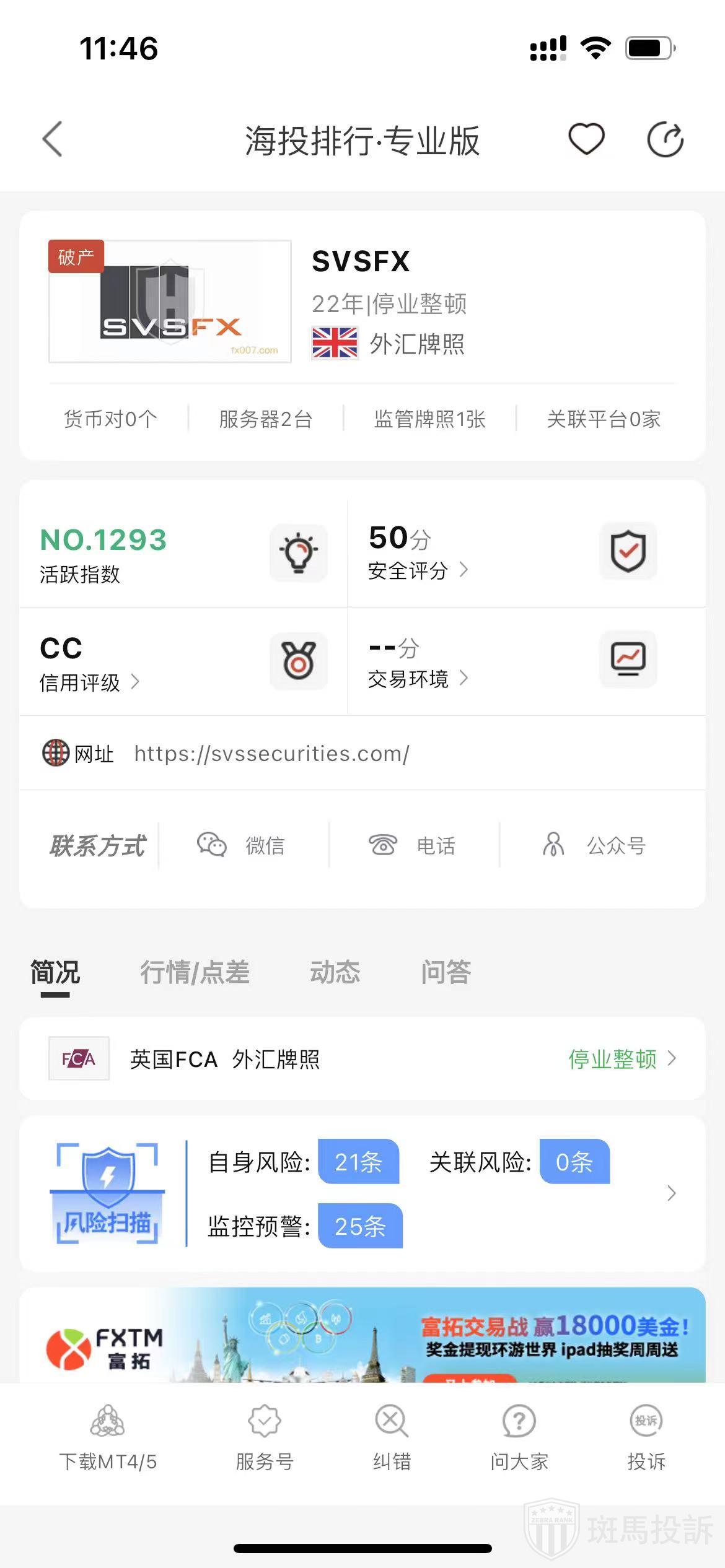 根据海投排行查询显示,这家平台叫SVSFX,成立于2002年,全球排名1290名,安全评分50分,平台宣传称拥有英国FCA外汇牌照,目前显示已经停业整顿,风险扫描46条.