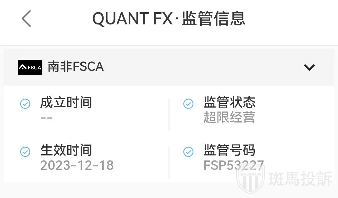 QUANT FX平台受南非FSCA 监管,取得金融服务牌照,监管号码FSP53227 ,属于超限经营范畴。