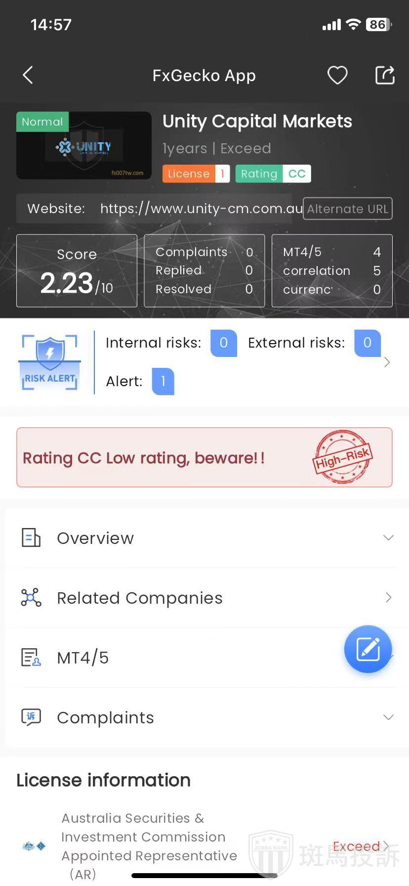Unity Capital Markets ,FxGecko评分2.23分,信用评级较低,建议投资者远离!