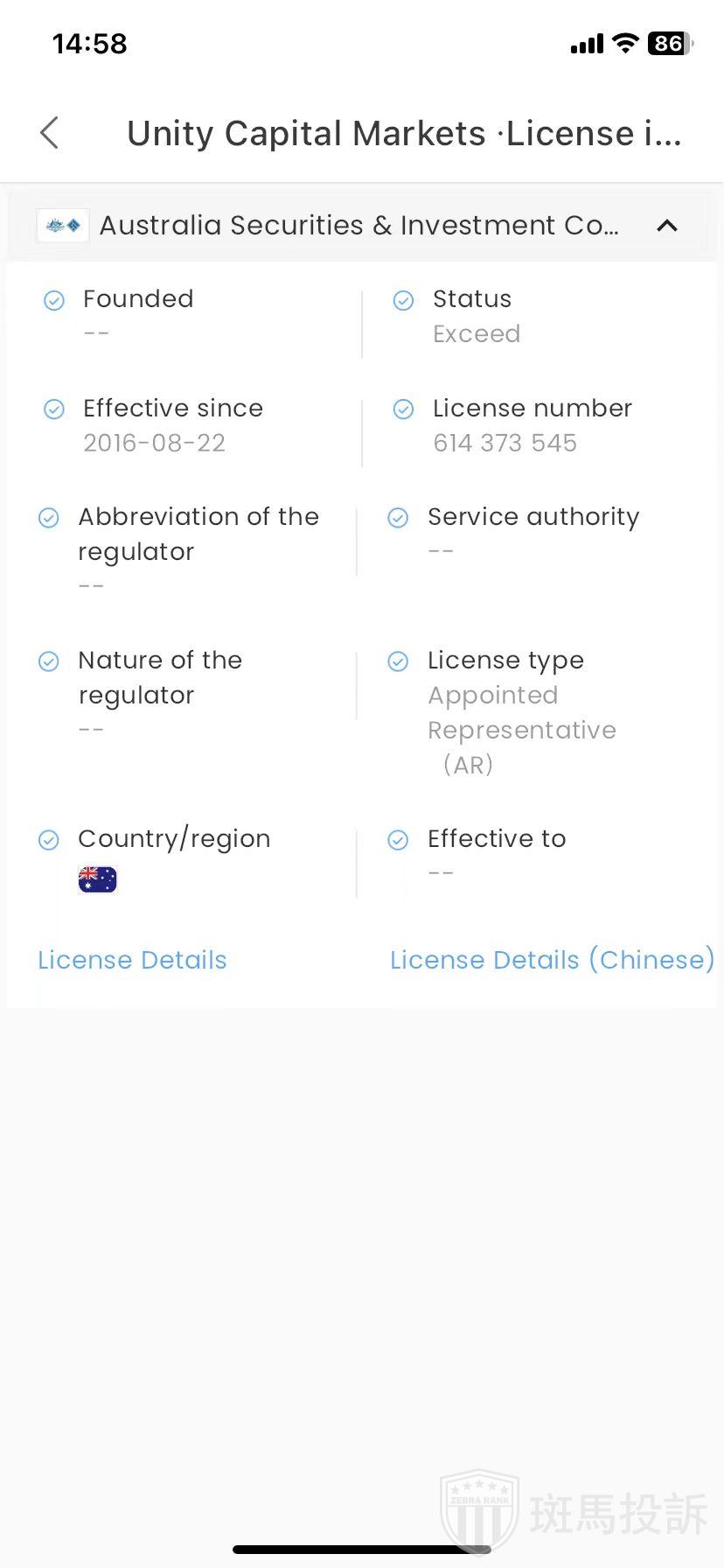 Unity Capital Markets ,在FxGecko显示1家监管信息。持有的澳大利亚ASIC监管状态为超限经营。投资者资金安全无保障!