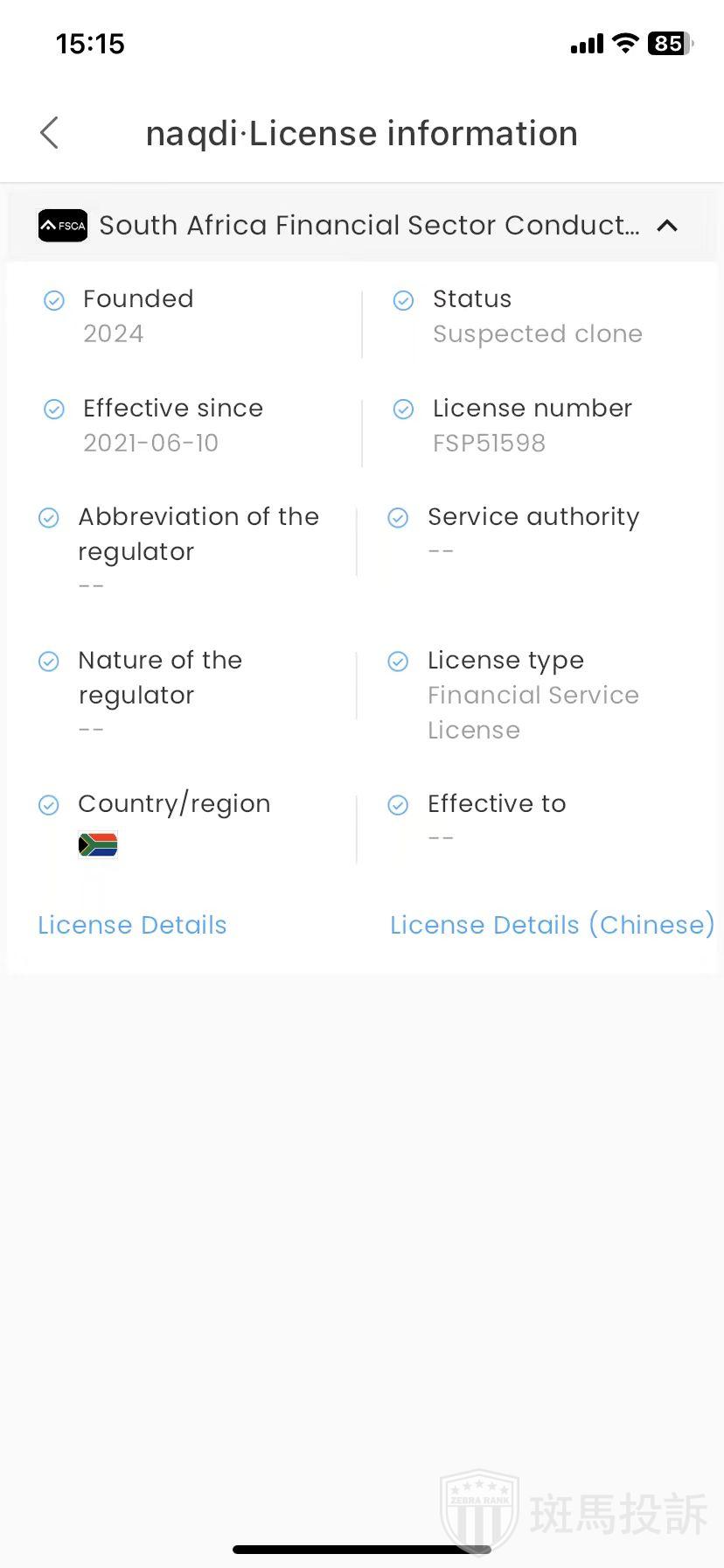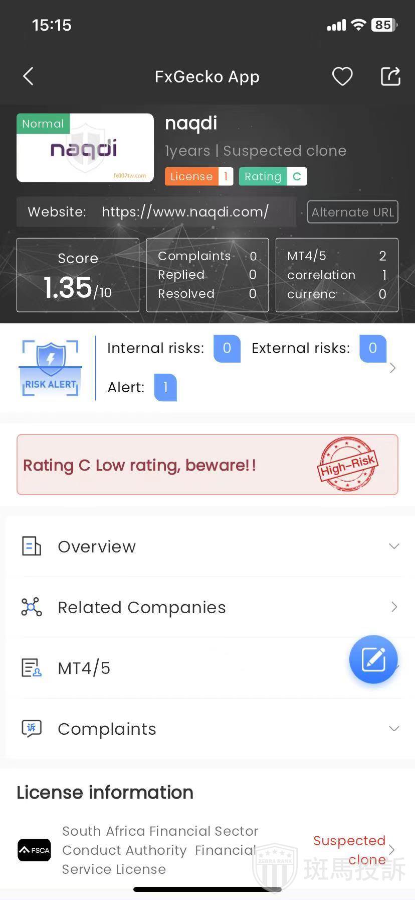 naqdi,在FxGecko显示1家监管信息。持有的南非FSCA监管状态为疑似套牌。投资者资金安全无保障!