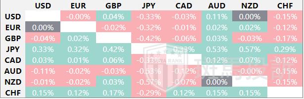 下表显示了澳元(AUD)对所列主要货币今日的变动百分比。澳元对日元最弱。