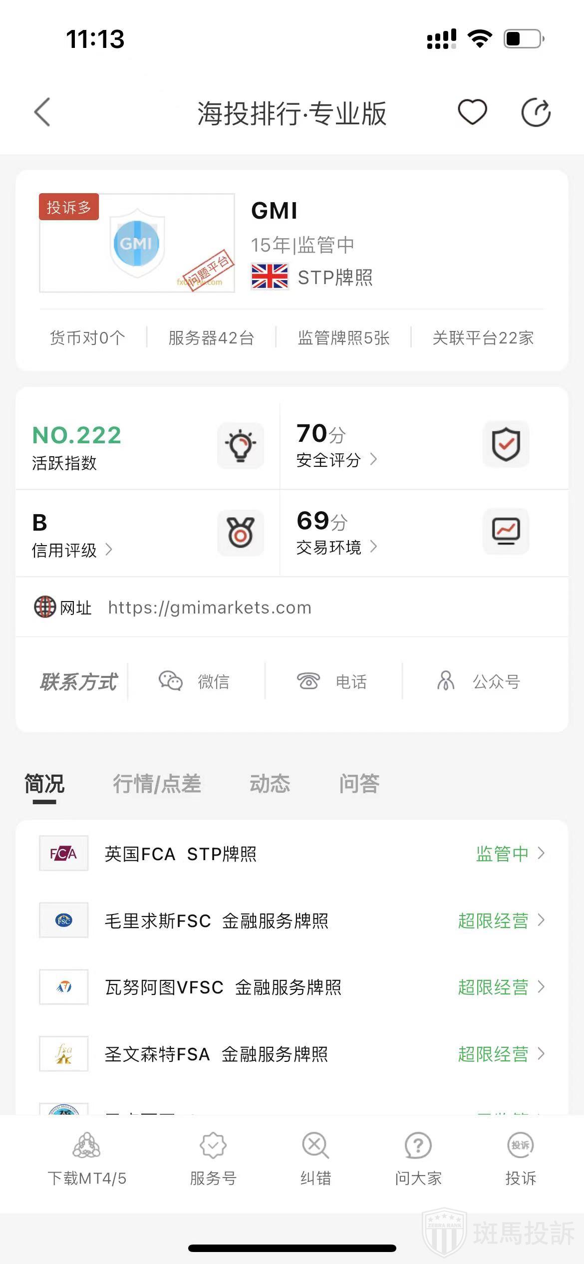 根据海投排行查询显示,这家平台叫GMI,成立于2010年,全球排名225名,安全评分70分,平台宣传称拥有英国FCA外汇牌照,瓦努阿图VFSC金融服务牌照,毛里求斯FSC外汇牌照,风险扫描预警有56条.