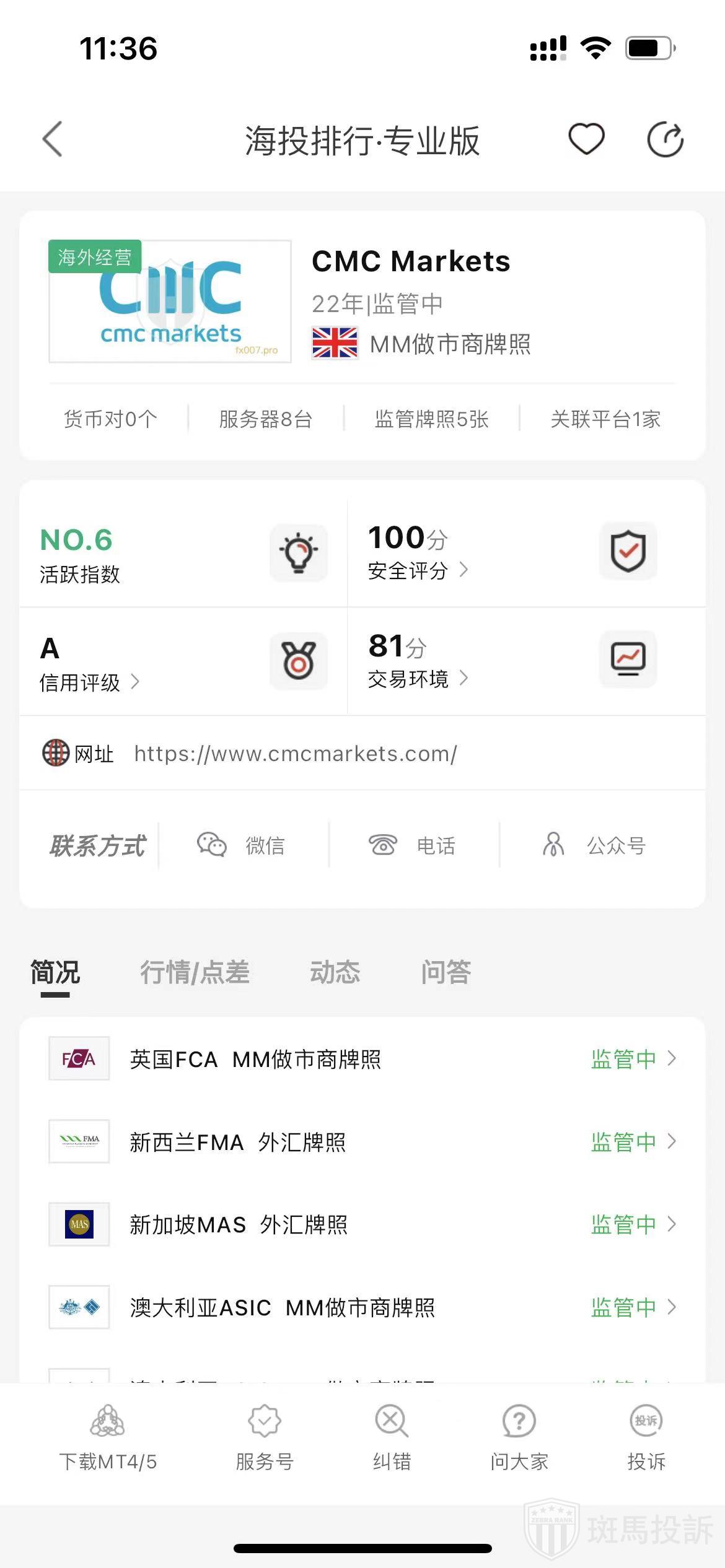 根据海投排行查询显示,这家平台叫CMC Markets,成立于2003年,全球排名6名,安全评分100分,平台宣传称拥有英国FCA外汇牌照,澳大利亚ASIC,新西兰FMA外汇牌,新加坡MAS外汇牌照等多个国家的监管牌照,风险扫描预警有233条.